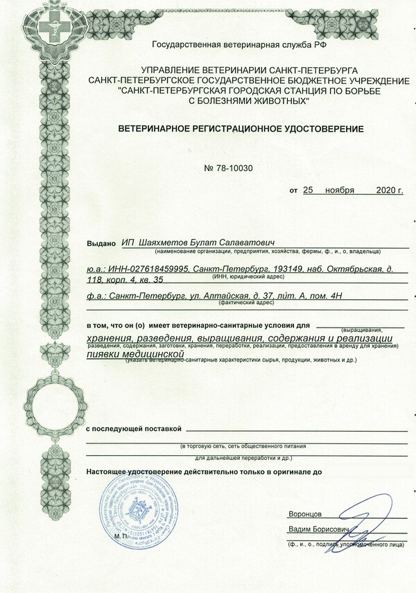 — все наши пиявки проходят ветеринарный контроль и зарегистрированы в системе "Меркурий" от Россельхознадзора