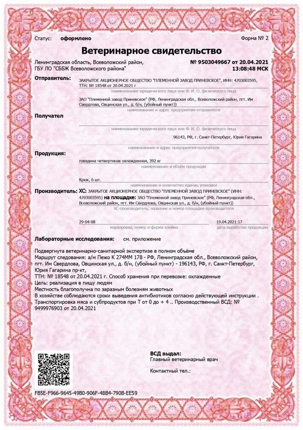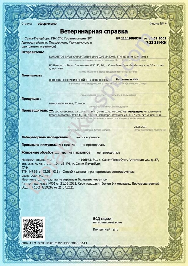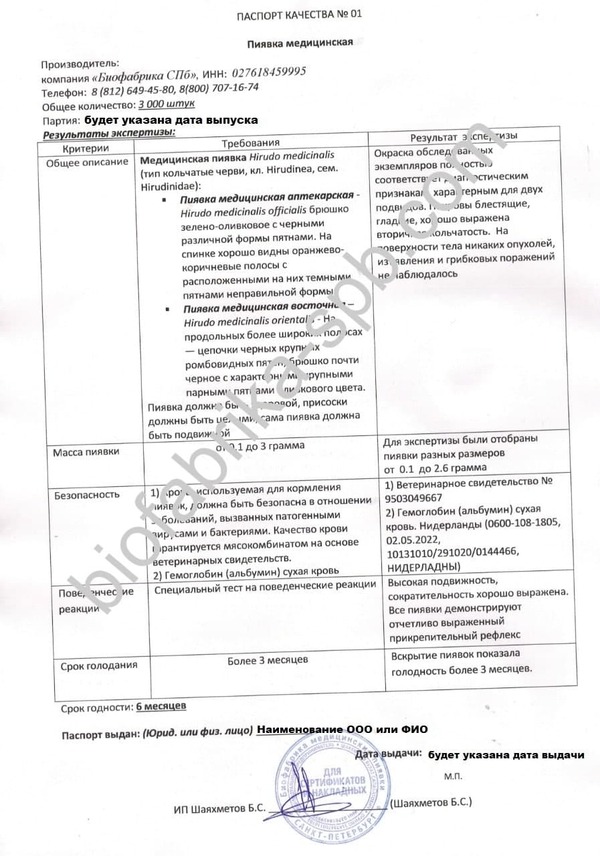 Пример ветеринарного свидетельство на кровь используемая при кормлении медицинской пиявки